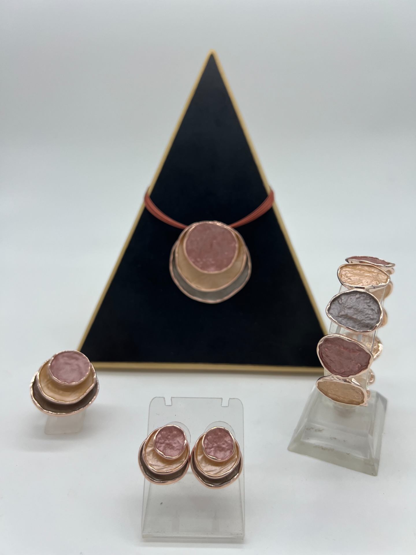 La nostra parure completa Circle Terracotta, delicata ed elegante. Composta da: Collana Circle, Bracciale Circle, Anello regolabile Circle e Orecchini Circle. Disponibili anche singolarmente.